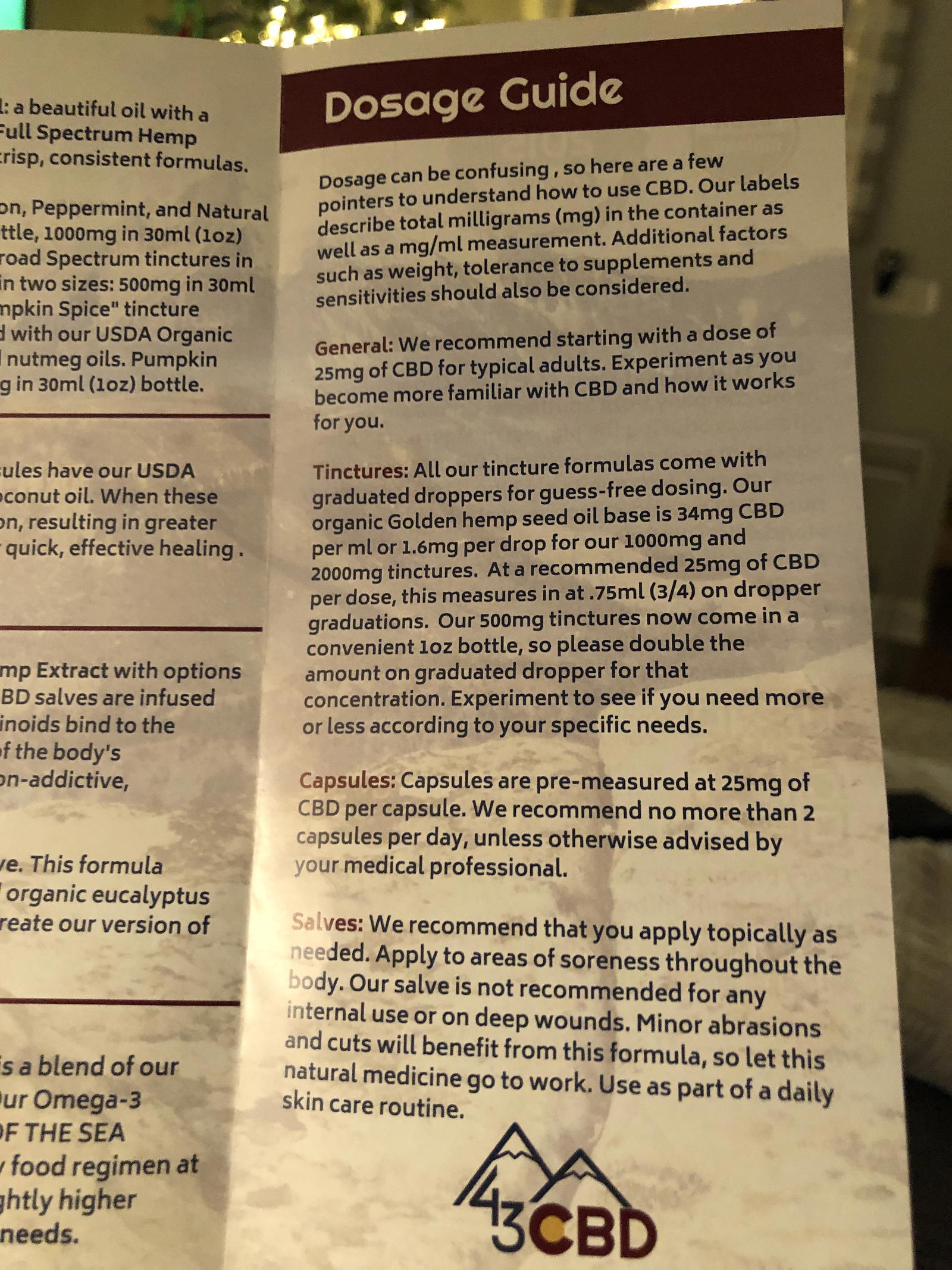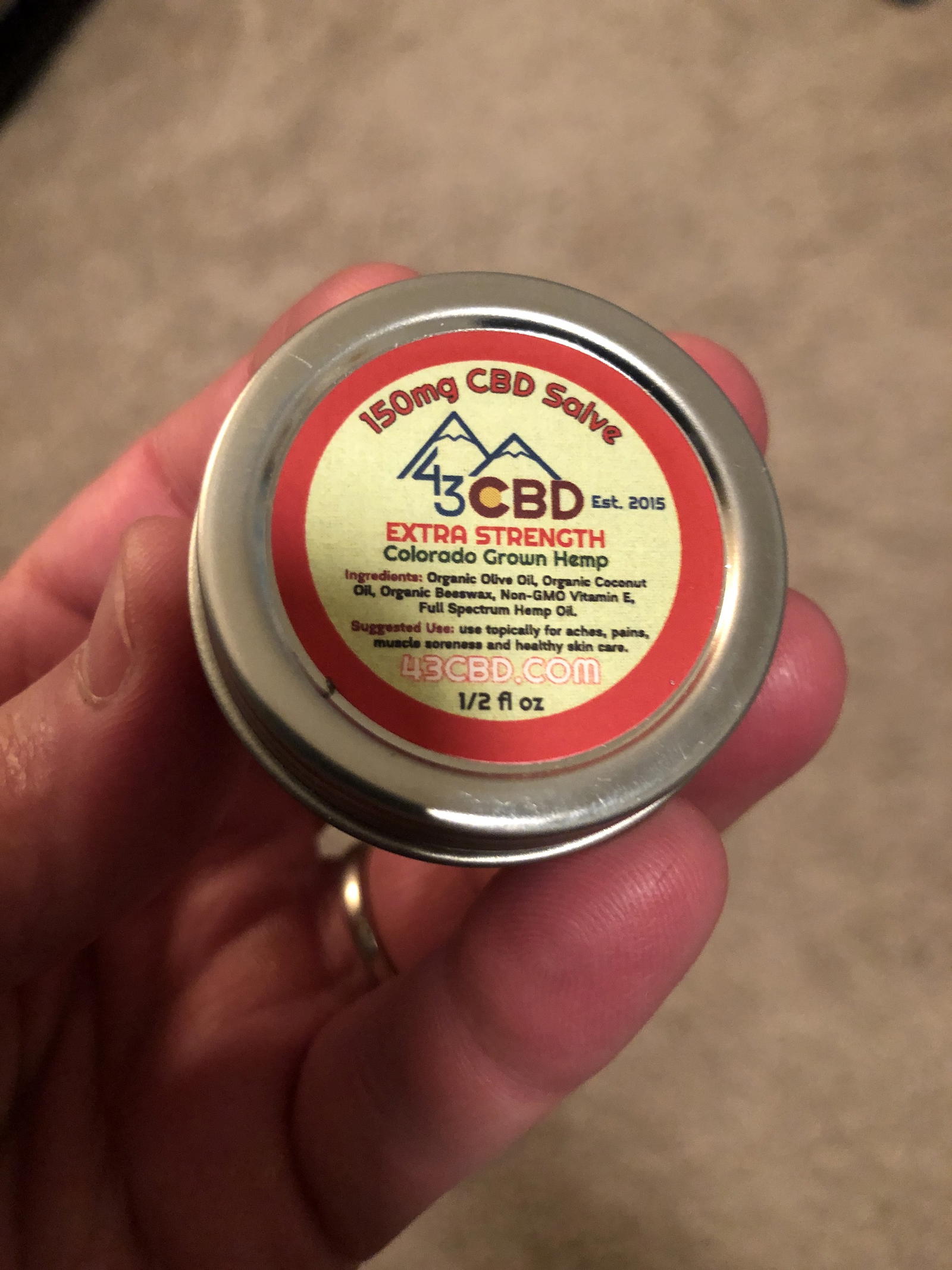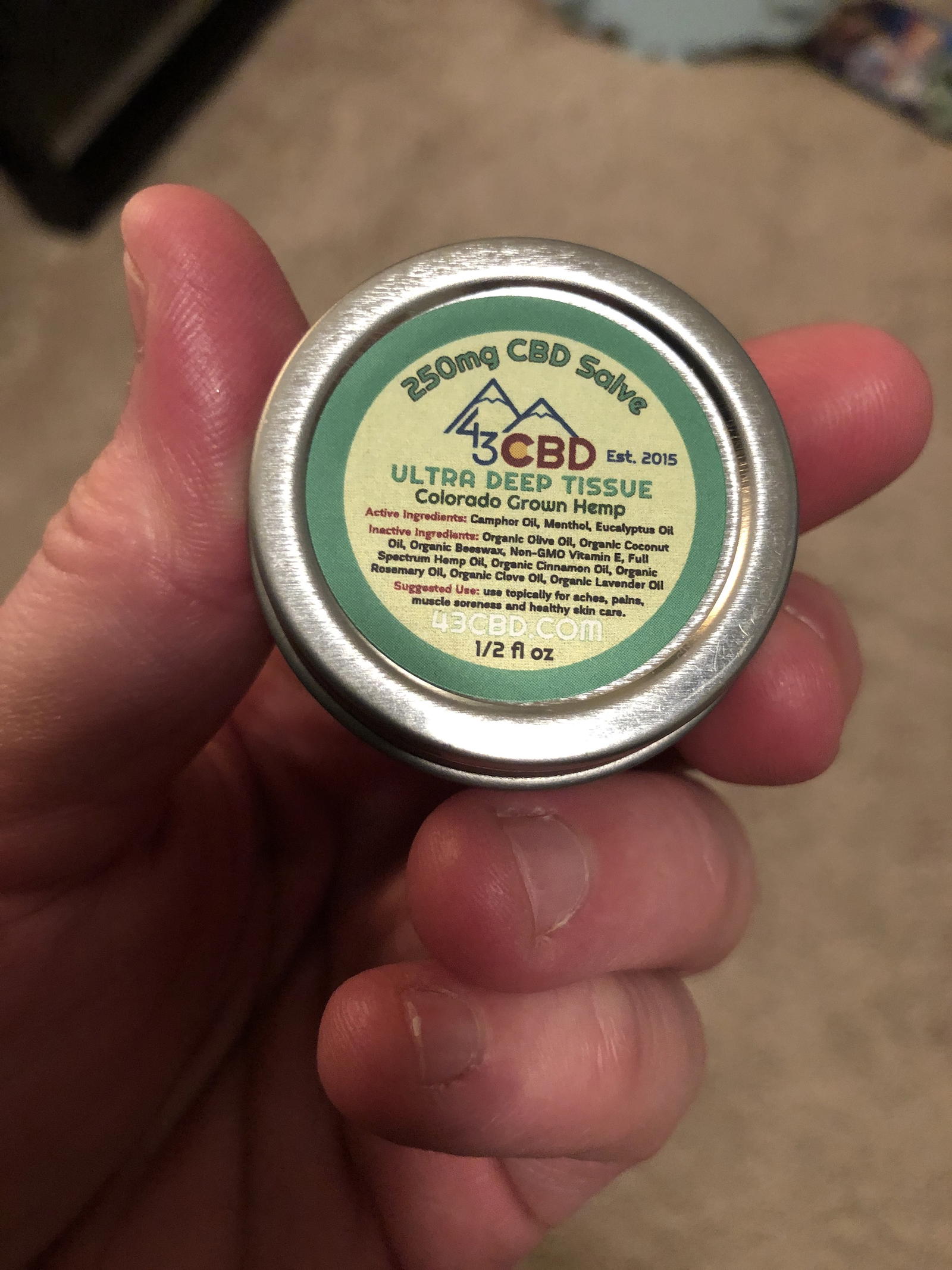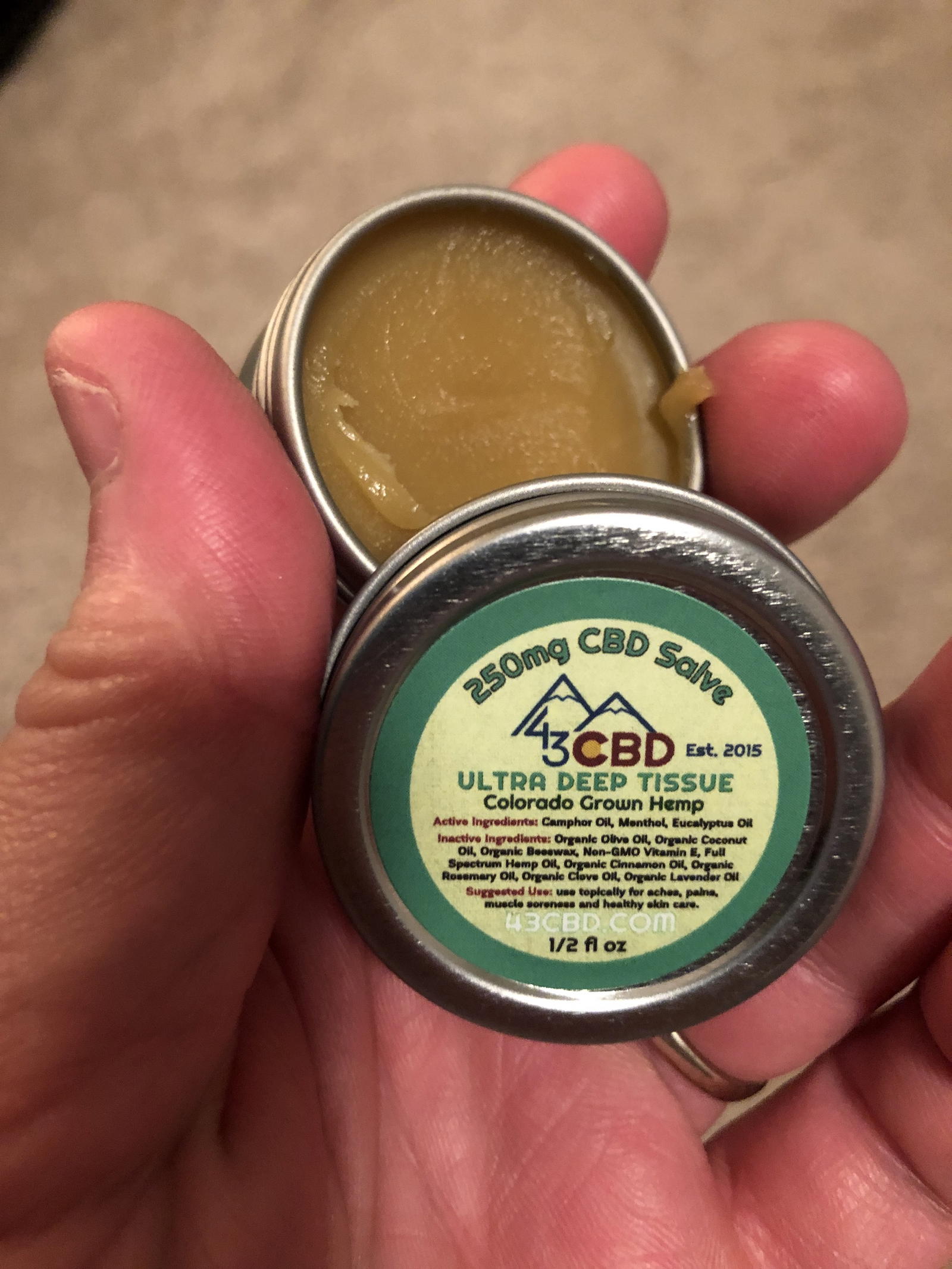 I’m thrilled to say that these products REALLY worked. Not sure if you’ve ever dealt with one of these ‘pinched nerves’ but typically when I get them it’s WEEKS before I’m back to normal. I took a couple of drops of tincture and used some of the 250mg salve and within a week or so I was back to as good as new (or at least as good as this 44 year old fat guy can be.