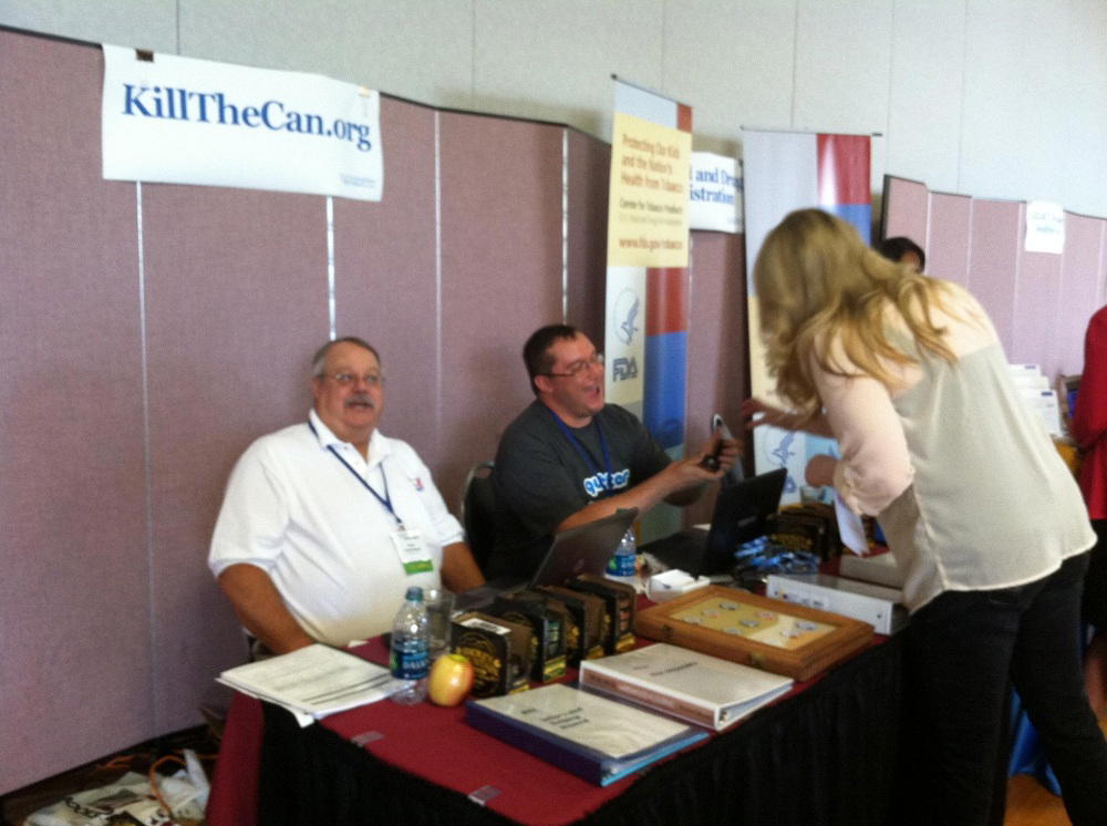 Day 1 of the Summit is in the books, and let me tell you…we’re tired. First of all, we were the most visited exhibitor today. Smokey Mountain Snuff, Nip the Grip, and Jake’s Mint Chew all sent samples of their products. Most people in attendance of the Summit today had no idea these product existed. It opened a lot of eyes here to people attending that were unfamiliar with the quitting process, and allowed us to wow them with these wonderful “conversation starters”. We also had a brochure for the site (Thanks J2B!), a display featuring the Hall of Fame coin (and respective chips), some KTC bracelets and drink holders, and Hall of Fame speeches from multiple years. We also had our computers to show off the site (but because wifi was spotty most of the day, chat was nearly impossible). We set up before breakfast and spoke to many people even before the first break. Our first speaker (Pam Ling – former Real World star now doctor) had a great theme to her session which ran throughout the day. She compared nicotine marketing to Godzilla. It lays dormant for years and nobody notices. Suddenly, it awakes to massive destructive actions. In fact, the companies are trying to rebrand Godzilla as a harmless gecko. Most of the sessions today dealt with the marketing of tobacco, and where it is heading. Smokeless ads were not meant to appeal to an audience that included white collar and office workers until the 90s. When they did appear, they looked a lot like the SNUS ads of today. They claimed it as a “safe alternative” and a “solution”. Just recently, I saw many ads saying the same thing about SNUS. It was obvious to everybody there that they offer solutions to quitting, but really just bridge the gap to other forms of continued usage. We also realized how far ahead we are above other programs with our program, site, and use of social media. Many of the groups there are still in an infant stage of creating a digital shadow and don’t know where to start. There are some other sites here, but we are the only true online support group in attendance. The others are education based, and looking for ways to retain quitters. The theme that surprised us the most is that many programs are not pushing the use of NRT’s when dealing with smokeless quitters. They are not effective, and these programs are looking for methods like ours for a voice and a plan. We are the cutting edge, my friends. Today has been a huge success. We’ve made a lot of friends, and a few doors could possibly be opening to the site because of that. Again, thank you KTC for trusting us to represent you. Thank you quitters (especially Copehater) for all of your donations to send us here. Thank you Coach Steve and everybody else that has helped promote the Summit beforehand. We’re excited for tomorrow! Wastepanel and Kdip (770 days and 1800 respectively)