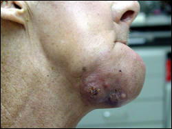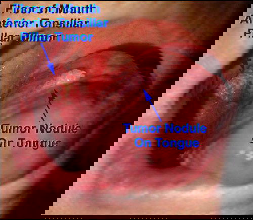 Squamous cell carcoma. They had to take out his jaw and most of his glands in his neck. They sewed his tougue to the inside of his cheek to keep his face from being disfigured. He always had trouble talking and eating. He got choked so easily. After twelve years the cancer came back in his lungs and bones and brain. It was horrible for him and the whole family. My husband lost a best friend he misses every day.