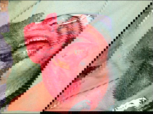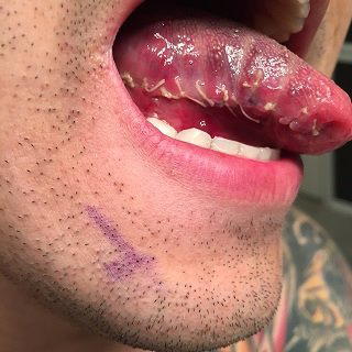 Does dippers really don’t mind having their face mutilated. The hole inside the mouth is concealable, but imagine having the hole outside your face. I quit after I got a bad bacterial infection in my mouth that discolored my tongue. Dipping is relaxing, but not worth the results from the pics above.