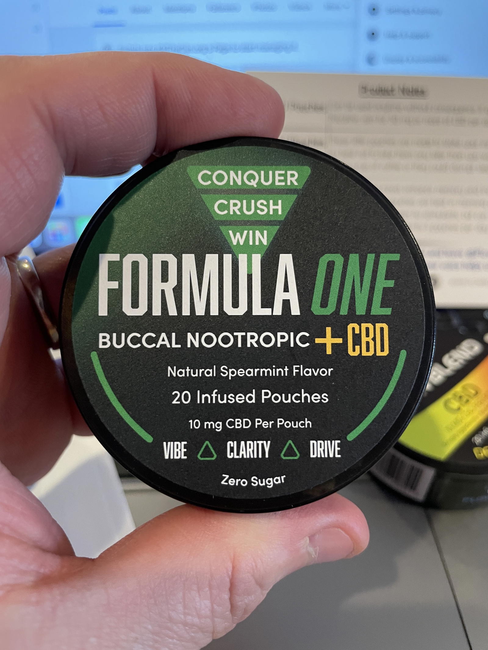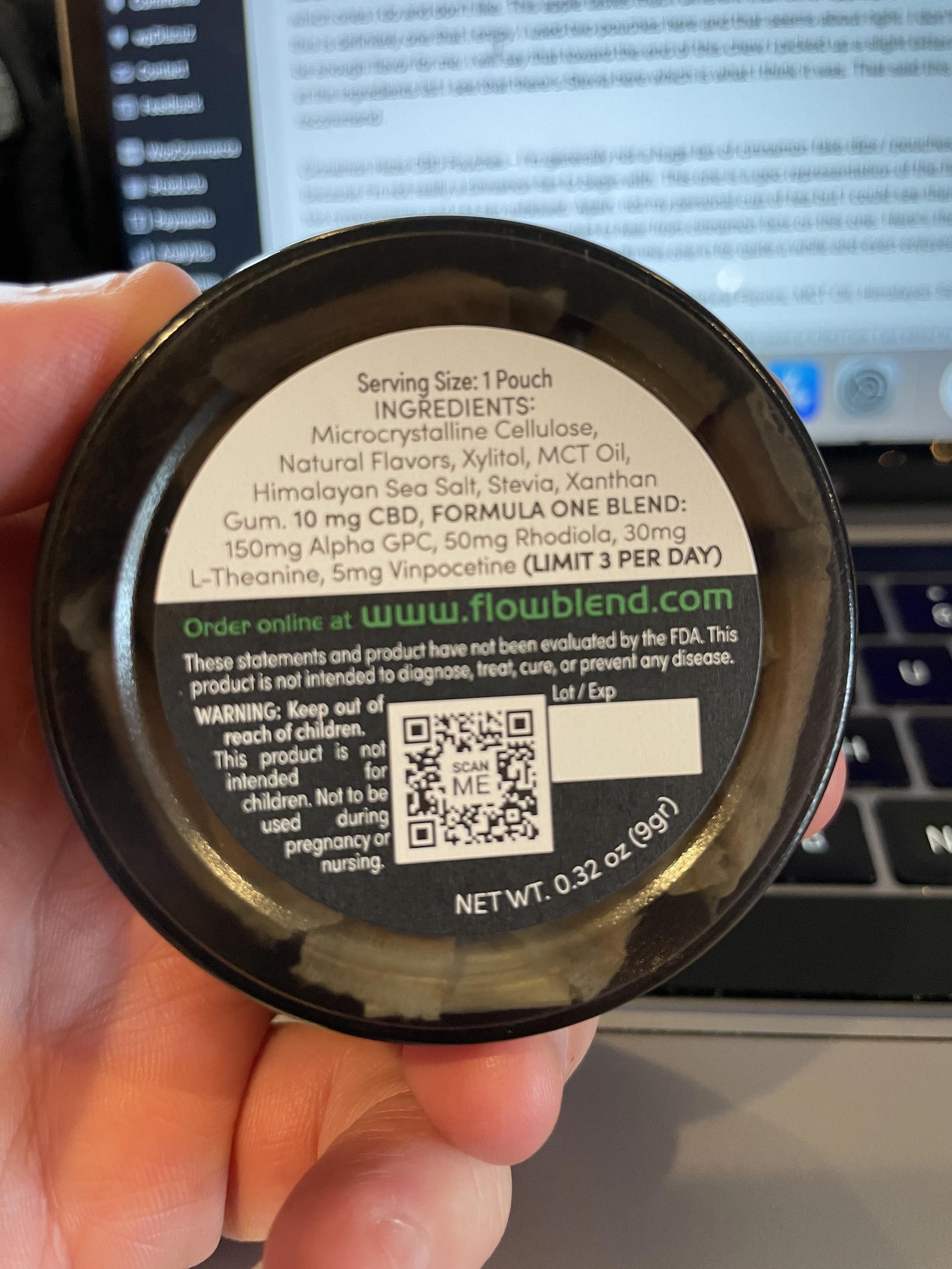 Ingredients from can: Microcrystalline Cellulose, Natural Flavors, Xylitol, MCT Oil, Himalayan Sea Salt, Stevia, Xanthan Gum. 10 mg CBD, FORMULA ONE BLEND: 150mg Alpha GPC, 50mg Rhodiola, 30mg L-Theanine, 5mg Vinpocetine (LIMIT 3 PER DAY)