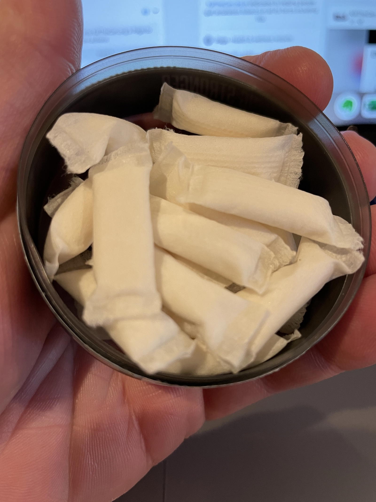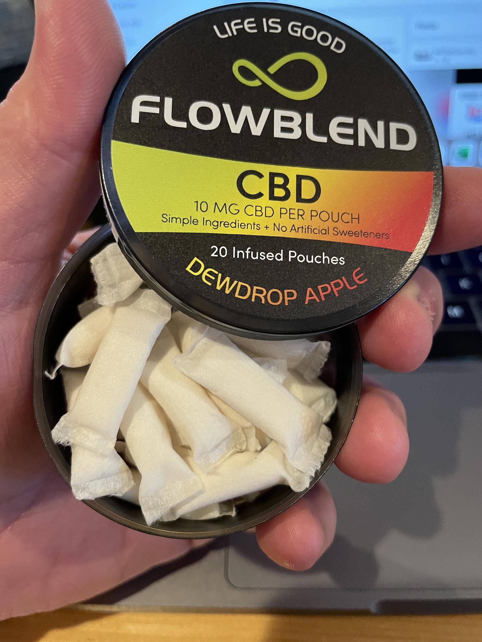 Once again, FlowBlend has really high quality cans and labels. It’s a small detail but one that I really appreciate. These are relatively small pouches, which to me means these are geared toward the snus / nicotine pouch users out there. As those two groups are on the upswing, seeing cessation products geared toward them makes me happy. The other thing you’ll notice about these pouches is that they’re SUPER dry. Not a bad thing as they produce quite a bit of saliva right away.