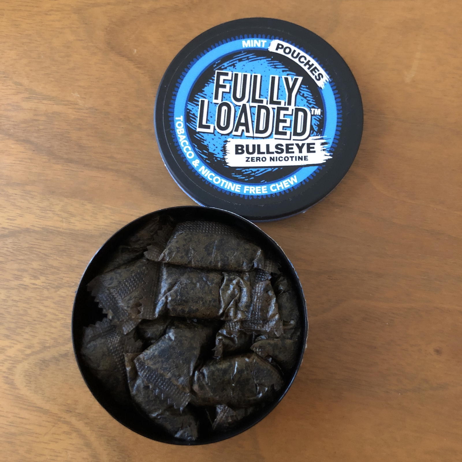 Great smells when opening the cans. All four flavors I tried are very moist and produce quite a bit of dark brown spit. The cans are plastic and have the ‘best used by’ date on the bottom which I really appreciate. Cans are clearly marked BULLSEYE – ZERO NICOTINE as well which is key. I didn’t count the number of pouches in each tin but they’re all .92 oz or 26 grams.