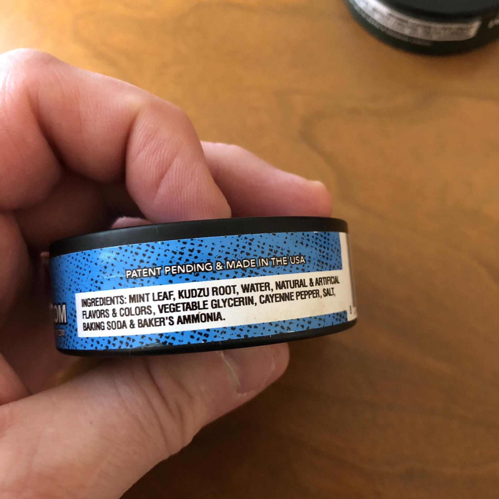 Mint Ingredients List (from the label): Mint Leaf, Kudzu Root, Water, Natural & Artificial Flavors & Colors, Vegetable Glycerin, Cayenne Pepper, Salt, Baking Soda & Baker’s Ammonia.