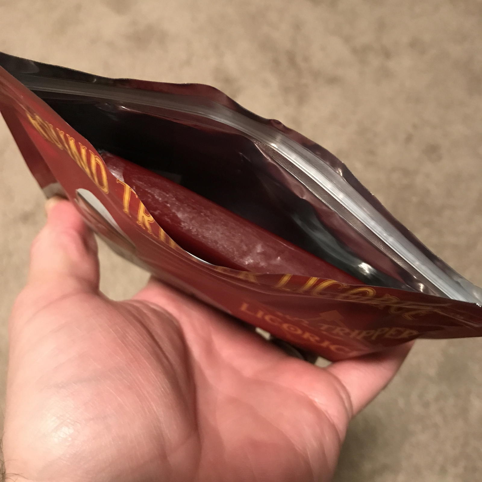 With my black licorice review I got a sample pack prior to production so I hadn’t seen the final packaging. This time I got the full retail packaging and was absolutely blown away. The pouch is great and really gives you that feeling of a traditional long leaf pouch in your back pocket. Pouch contains nutrition facts (it’s a food product after all) and ingredients (below). I’m going to repeat much of what I wrote during my black licorice review for this red licorice review.