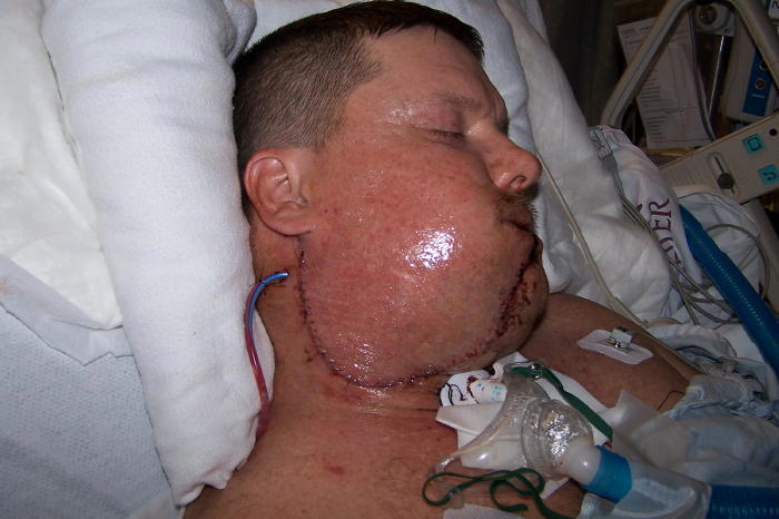 Now it was time to take care of it. My operation lasted some eleven hours. A large section of gum matter, three teeth and thirty seven lymphnodes were removed. My jawbone was shaved to half of it’s thickness and a plate with screws added for reinforcement. A section of flesh was removed from my leg and now and forever resides in my mouth.