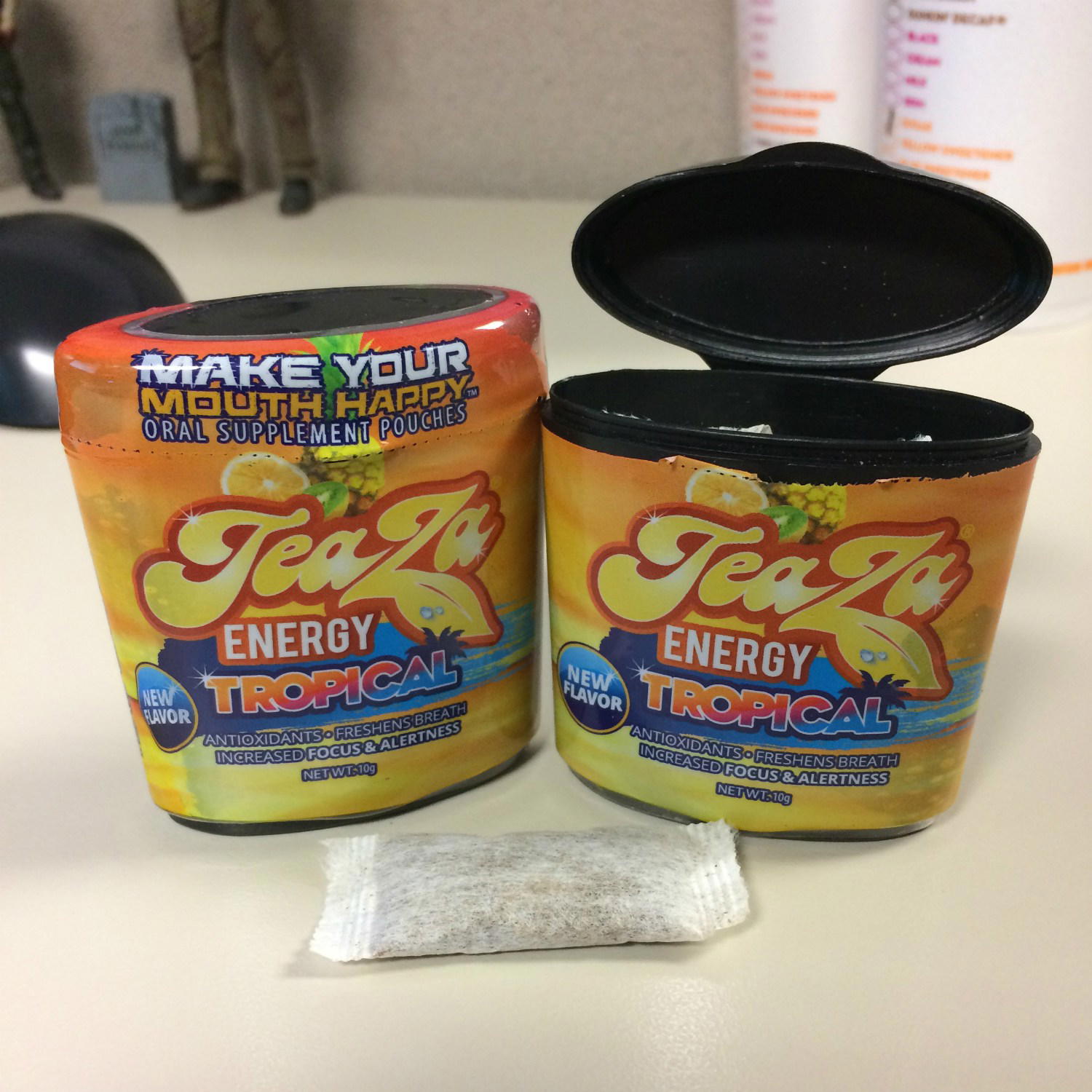 If you’re not familiar with TeaZa you can check out my original review of their products here or their other flavors Cool Mint, Black Cherry or Bangin’ Black Cherry. TeaZa are small pouch products designed to boost energy and mental focus while providing oral satisfaction. The packaging of TeaZa Tropical says it contains, “Antioxidants, Freshens Breath” and offers “Increased Focus & Alterness”.